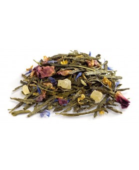 Thé vert de Chine, morceaux d'ananas sucrés , de noix de coco, fleurs de bleuets, pétales de rose et de tournesol, arôme naturel d'ananas et noix de coco