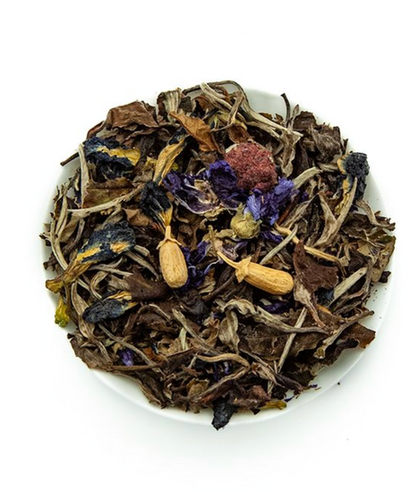 Ce thé blanc de Chine, délicatement parfumé aux fleurs de pois papillon, framboises entières, boutons de fleur d'oranger et fleur de mauve, vous transportera vers un havre de paix et de sérénité.