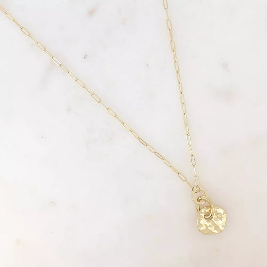 Collier sur chaîne en acier inoxydable composé d'une maille aux anneaux allongés et d'un pendentif de 3 pièces (2 anneaux et une pièce carrée martelée).