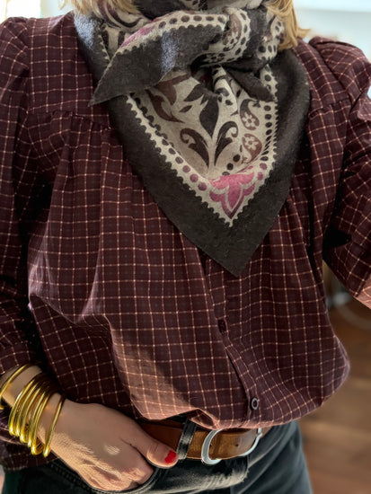 une chemise format blouse 100 % coton à carreaux, légère et très agréable à porter en toute saison. On peut porter un seconde peau dessous pour les jours plus frais. Sa coupe fluide s'adapte à toutes les morphologies. Le col à petits volants et les fronces sur la poitrine apportent une touche très féminine et raffinée. Se porte aussi bien avec un jean qu'avec un pantalon plus habillé ou même une jupe. Un basique pour la garde robe .