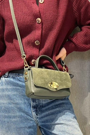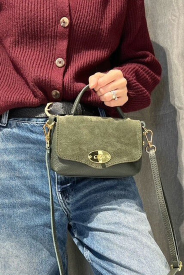 Sac à bandoulière en cuir grainé et daim, petit format, bandoulière en cuir, petite poche à l'intérieur, dimensions : L19xH13x5.5cm. Tellement pratique et joli quand on n'a pas besoin de notre bag XXL.