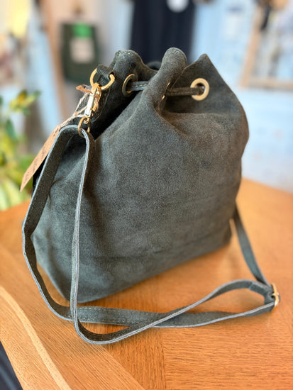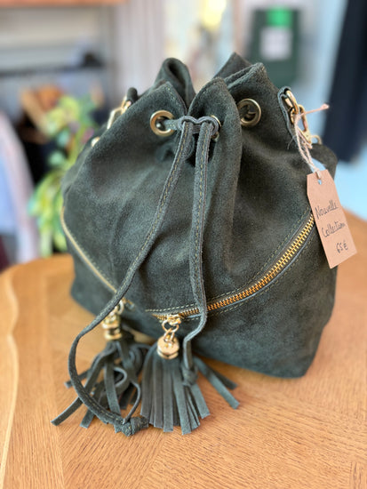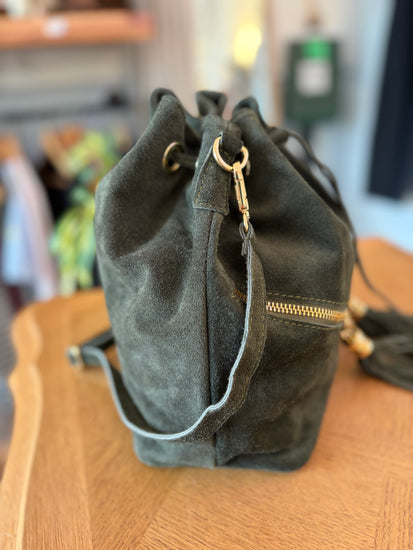Sac bourse en daim, petite poche à l'intérieur, fermé par lacets, bandoulière en daim amovible incluse, poches de décoration sur devant, dimension : L25xH26x13 cm