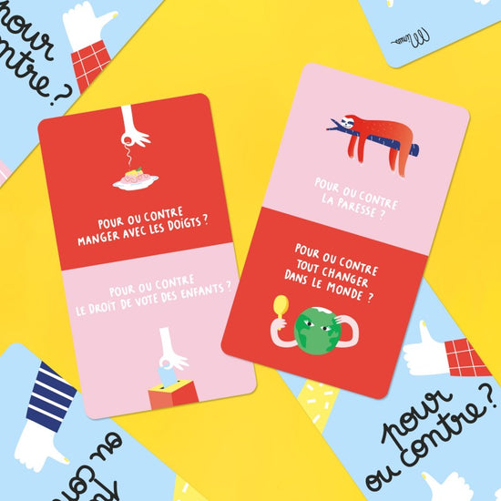 POUR OU CONTRE est un jeu imprimé avec des encres végétales par un imprimeur certifié et conditionné par des travailleurs handicapés, le tout, tout près de Lille en France.