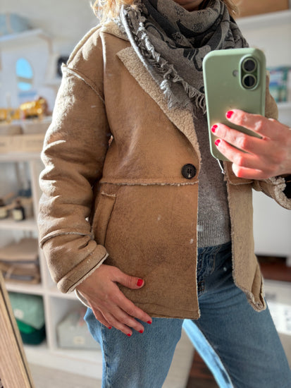 Manteau en simili cuir avec doublure en peau de mouton. Chic et confortable, idéal pour un look décontracté. Poches déco. Taille unique , du 36 au 42.