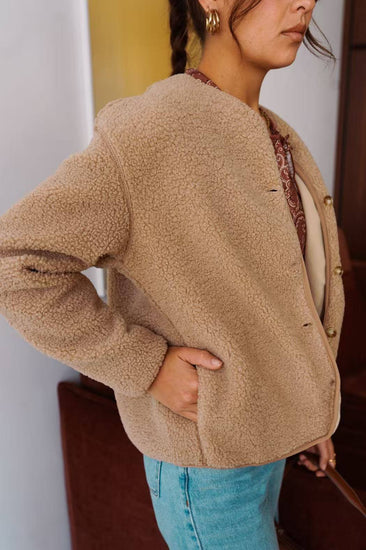 Confectionnée dans une matière effet mouton au toucher moelleux, elle combine confort et style minimaliste. Sa coupe droite et son col rond lui donnent une allure à la fois décontractée et élégante.